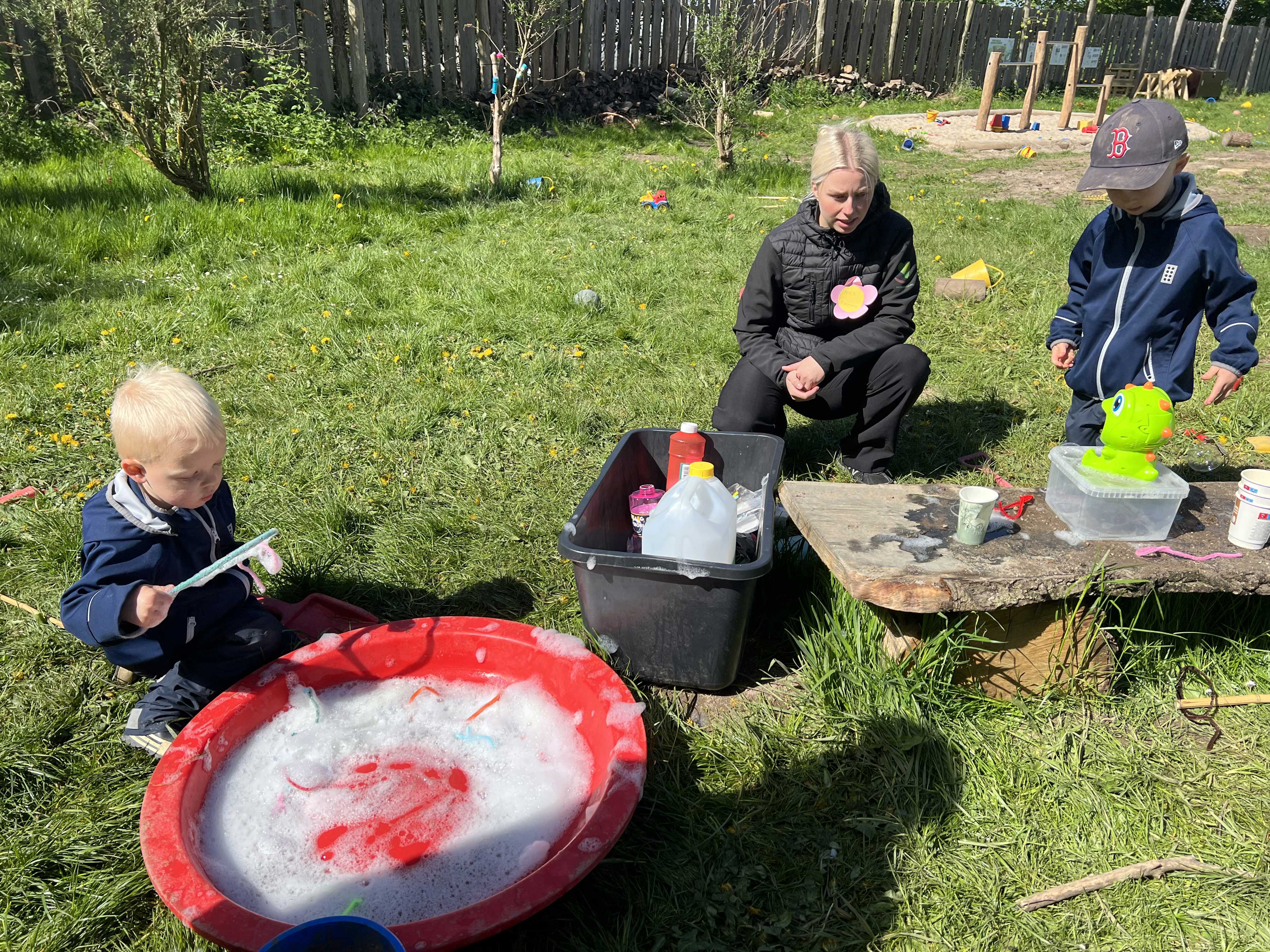 Vi hjælper hinanden med oprydning på grupperne, børnene vasker hænder, har toiletbesøg og bleskift.